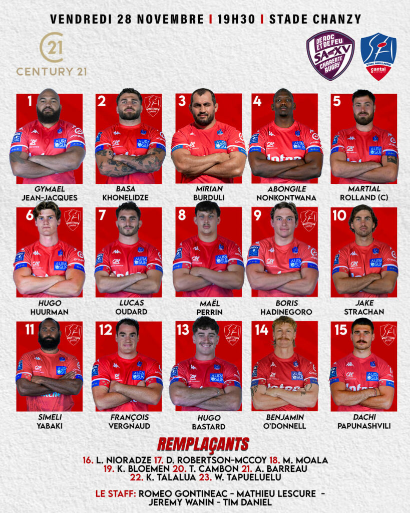 ~ Voici la composition de votre équipe pour la douzième journée de Pro D2. Les 𝐑𝐨𝐮𝐠𝐞 & 𝐁𝐥𝐞𝐮 reçoivent se déplacent en Charente pour défier les Angoumoisins sur leur pelouse de Chanzy. ~