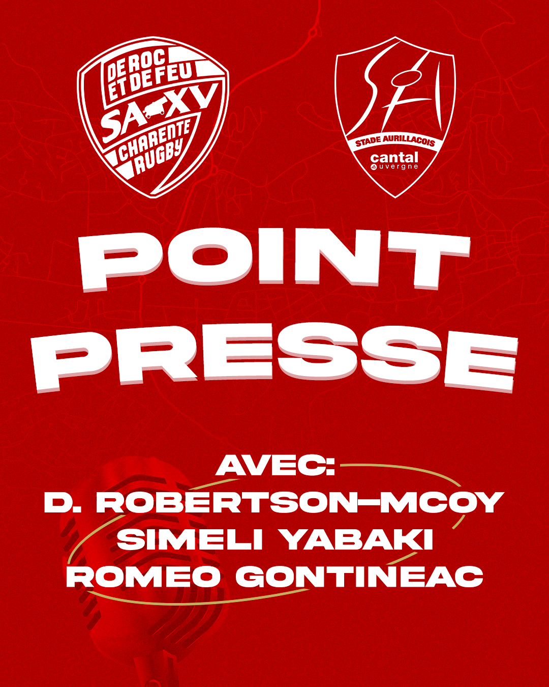 À un peu plus de 48h du coup d’envoi de Soyaux AngoulĂȘme XV – Stade Aurillacois, retrouvez les mots clĂ©s de Simeli YabakiDominic Robertson-Mccoy et du manager gĂ©nĂ©ral Romeo Gontineac.