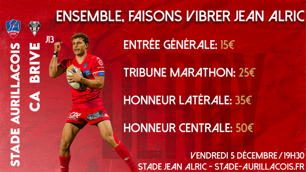 À un peu plus d’un mois du coup d’envoi de Stade Aurillacois – CA Brive, voici les premières informations concernant la billetterie de ce derby au Stade Jean Alric !